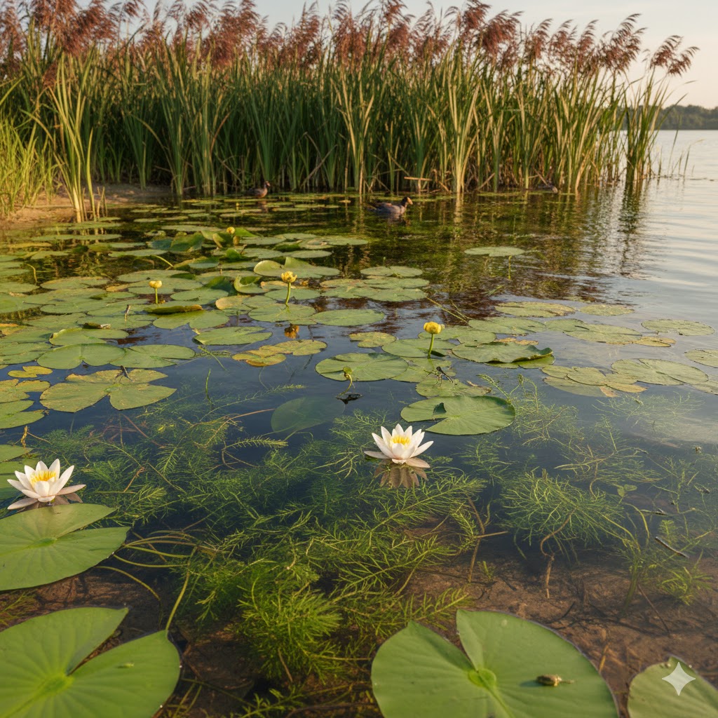 - Wasserfilterung: Wasserpflanzen nehmen Nährstoffe wie Nitrate und Phosphate aus dem Wasser auf, was der Algenblüte entgegenwirkt und zur Wasserklärung beiträgt.